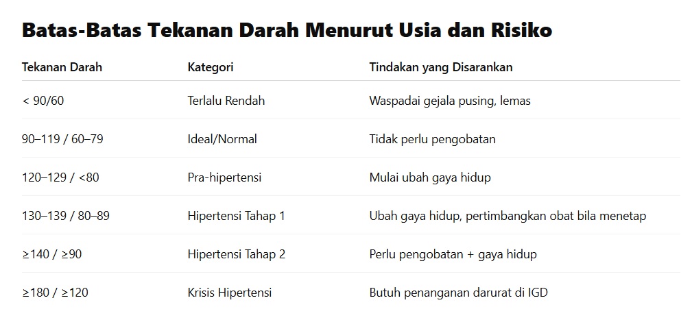 Meski demikian, ada toleransi batas. Tekanan darah sedikit lebih tinggi atau lebih rendah bisa tetap dianggap normal tergantung usia dan gejala yang menyertainya.